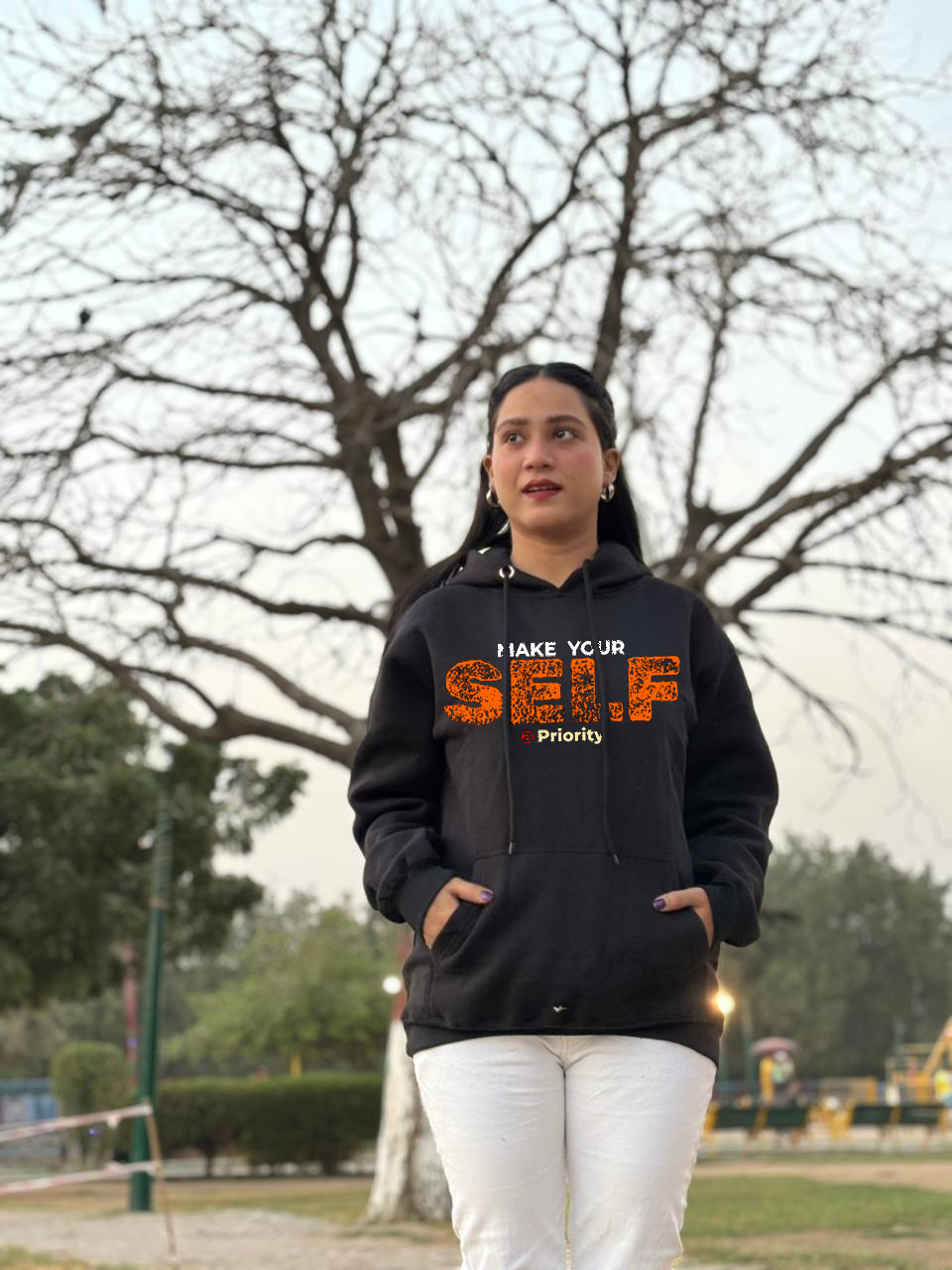 Embrace the chill and your self-worth with our exclusive "Make Yourself a Priority" black hoodie. This isn't just a piece of comfortable apparel; it's a powerful statement and a daily reminder to put your well-being first. Featuring bold, textured orange lettering, this hoodie brings a pop of motivational color to your wardrobe. Perfect for those crisp morning walks, cozying up indoors, or making a confident statement wherever you go.